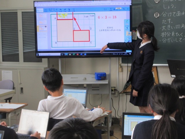 面積の学習で、タブレットで自分の考えをまとめ、発表しました。
