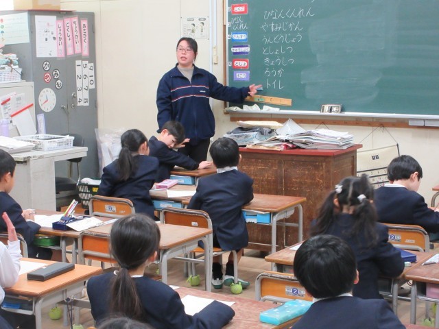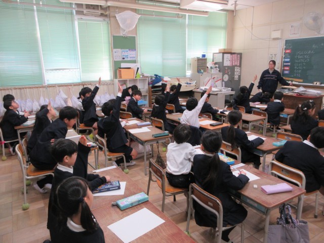 1年生は、学校で自分たちが過ごす場所で地震が起こったらという想定の話を担任の性先生から聞きました。