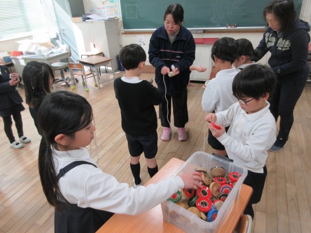 こま回しはなかなか難しいようです。