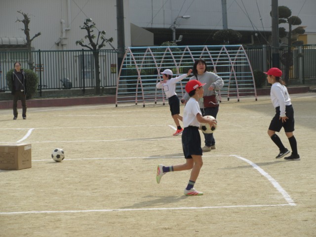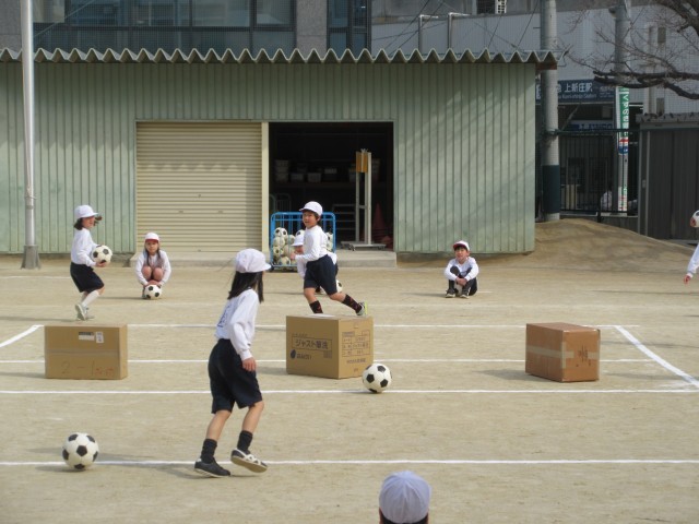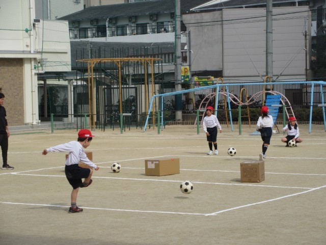 ボールを蹴って、箱にあてる運動をしました。
