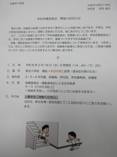 2月18日(水)に行われる学校保健委員会の開催場所を講堂から多目的室に変更します。ご確認ほどを、よろしくお願いします。