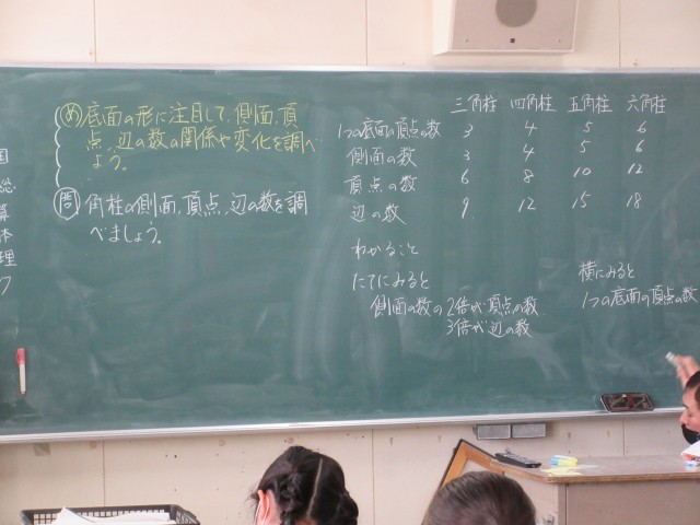 底面の形から、側面、頂点、辺の数の関係や変化を学習をしました。