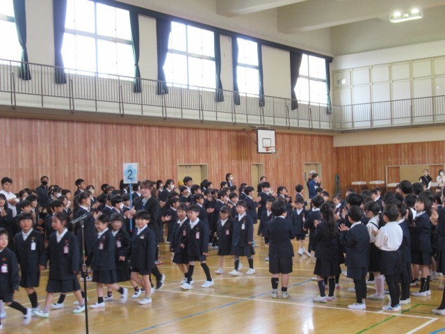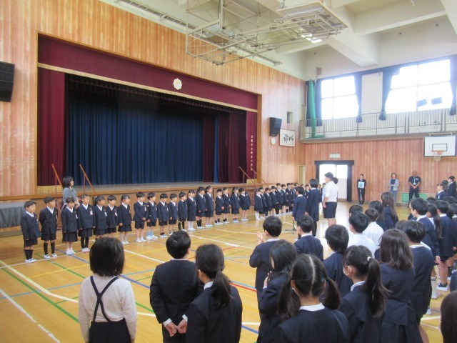 代表の6年生のおむかえの言葉の後に、全員で「1年生のみなさん、なかよくしようね。」と優しく声をかけると、1年生も「よろしくお願いします。」と大きな声でしっかり答えていました。