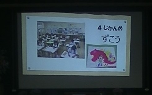 その後、担任の先生の紹介があって、2年生が作った「1年生の一日」というスライドショーが上映されました。