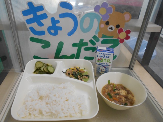 〇4月21日(火) マーボーどうふ きゅうりの中華あえ ツナとチンゲンサイのいためもの ごはん 牛乳