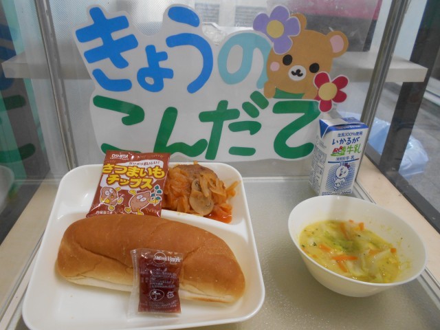 〇4月22日(水) 煮こみハンバーグ コーンスープ おさつチップス いちごジャム コッペパン 牛乳