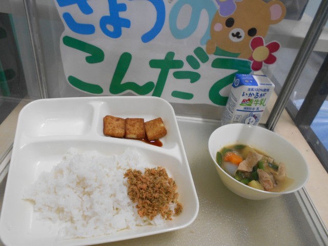 〇4月23日(木) 鶏肉とじゃがいもの煮もの あつあげのしょうゆだれかけ 紅ざけそぼろ ごはん 牛乳