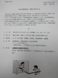 2月18日(水)に行われる学校保健委員会の開催場所を講堂から多目的室に変更します...