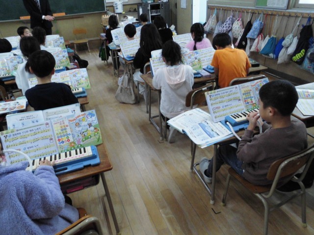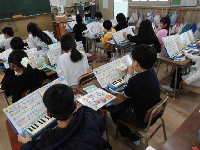 いつも元気いっぱいの2年生。音楽の時間も大きい声で歌ったり、楽しそうにリズムを取ったりしています。今日は鍵盤ハーモニカで「おおきなくりのきのしたで」を練習しました。運指に苦戦しながらも、みんな一生懸命に取り組んでいました。