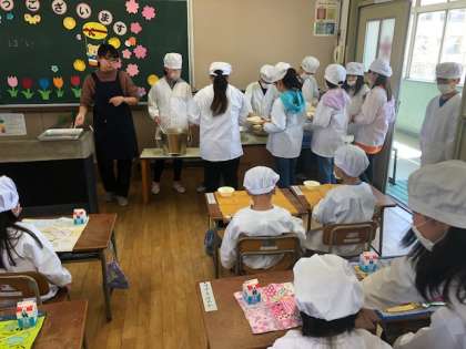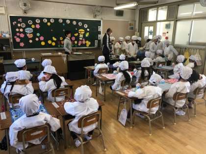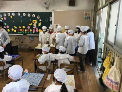 1年生の給食準備を6年生がお手伝いしてくれています。給食室から教室まで運び、一人ひとりの机に配膳してくれました。1年生の児童は、全員に配膳されるまで静かに姿勢良く待っていました。
