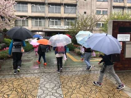 今朝の登校は、雨が降り続ける中を1年生も傘をさして各班、交通ルールを守って集団登校できました。