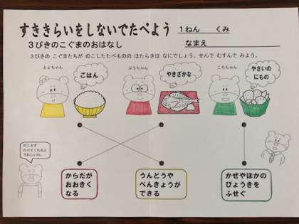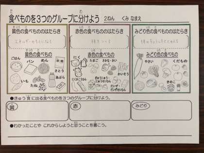 2年1組、2組各学級で食に関する指導をしました。食品の栄養について1年で学んだことを振り返り、様々な食品を分類して食品のはたらきについてより深く学習しました。