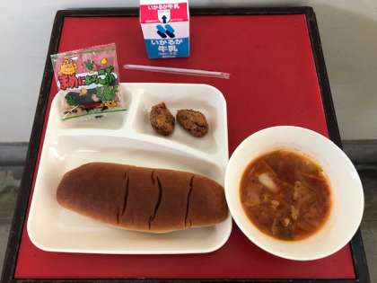 本日の給食献立は、 *一口トンカツ *ミネストローネ *豆こんぶ *黒糖パン、牛乳