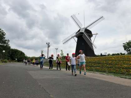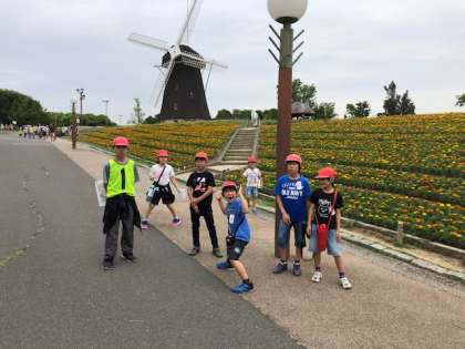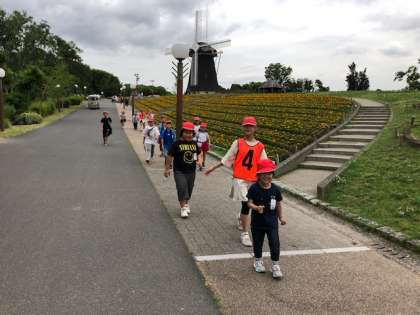 鶴見緑地公園のシンボル、風車の前を元気に通過して行きます。6年生の班長が、優しく世話をしてくれています。