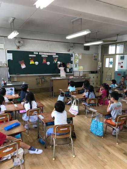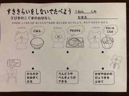 1年生が、食に関する指導で食べもののはたらきについて、栄養教諭から「3びきのこぐまのおはなし」で「すききらいをしないでたべよう」を題材に学びました。