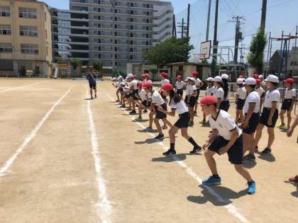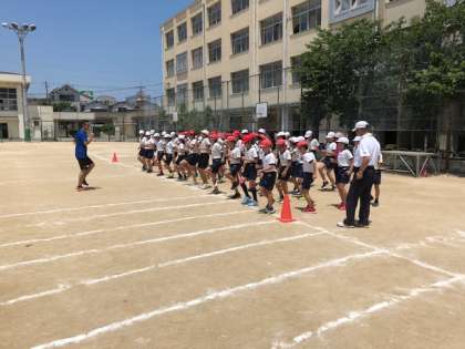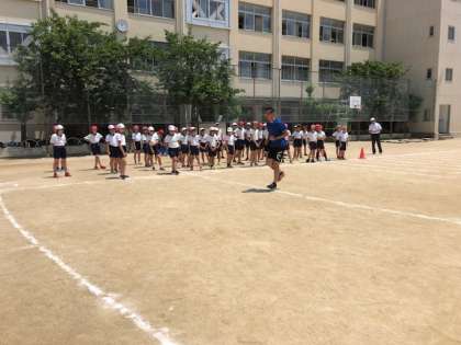 「夢・授業」前半の講演の後、休憩を挟んで陸上競技の走り方の基本について丁寧な指導を受けました。