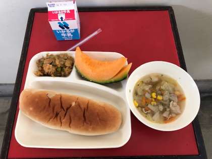 本日の給食献立は、 *カレードリア *スープ *クインシーメロン *おいもパン、牛乳