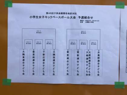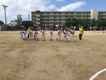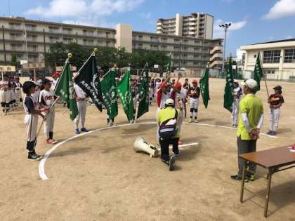 東淀川区子供会親善キックベースボール大会が、大隅東小学校の運動場で開催されました。大隅東小学校チーム6年生が力強い選手宣誓をしてくれました。各チーム2試合の予選リーグの結果で決勝進出をめざし全力プレーで熱戦が繰り広げられました。