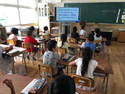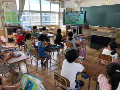 2年生は、大型テレビの映像画面と音声から英語に親しんでいます。また、アルファベットについて、文字と音声の関係を感じとっています。