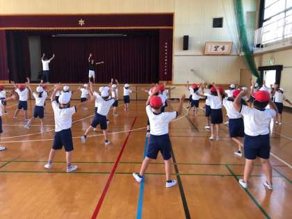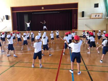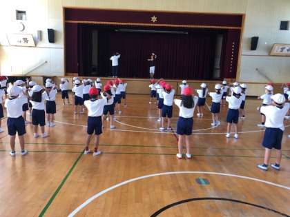 1・2年生が、運動会の練習を始めました。一つ一つの動きを指導者の動きに合わせて一生懸命に覚えていました。