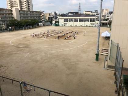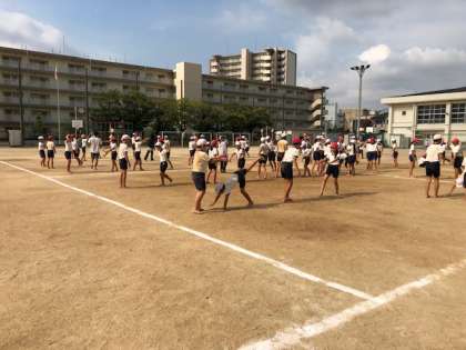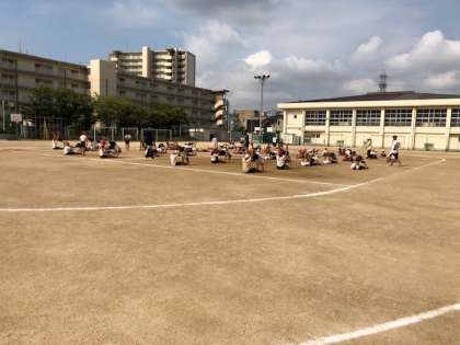 連日、猛暑が続きますが、5・6年生が、運動会の団体演技の組体操の練習に励んでいます。今日は、朝の暑さがましな1時間目に練習しました。