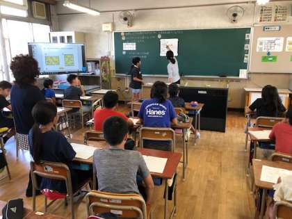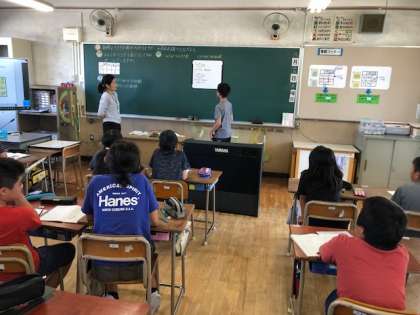 5年生が、算数科で1単位当たりの数量による比べ方の学習をしています。平均や混み具合をいくつもの数学的な考え方から導き出しています。