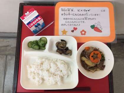 本日の給食献立は、 *肉じゃが *焼きなすのみそだれかけ *あっさりきゅうり *米飯、牛乳