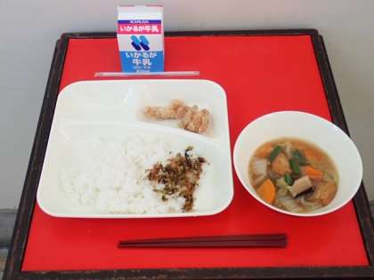 給食献立は、 *鶏肉のたつたあげ *あつあけと野菜の煮もの *おかかなっ葉 *米飯、牛乳