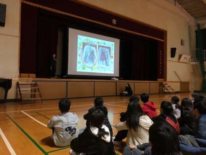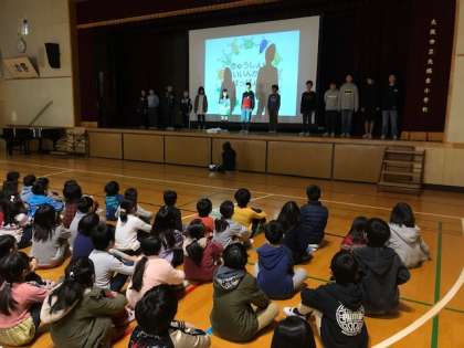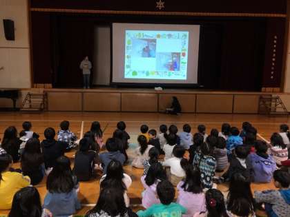 給食後の食器、食缶などの返却マナーについてクイズを交えた分かりやすく、楽しい発表でした。