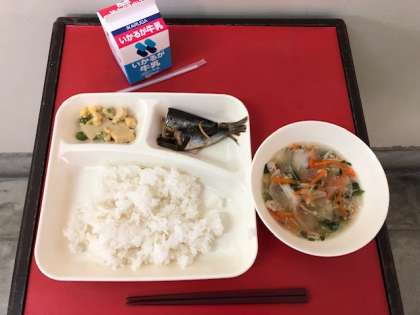 本日の給食献立は、 *いわしのしょうが煮 *高野豆腐の卵とじ *うすくず汁 *米飯、牛乳