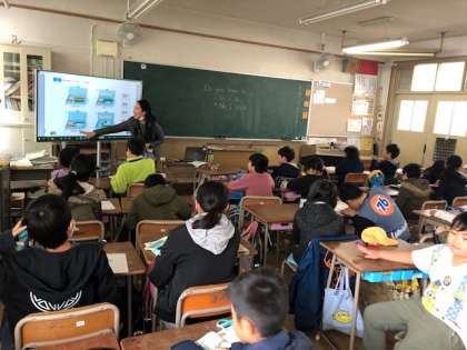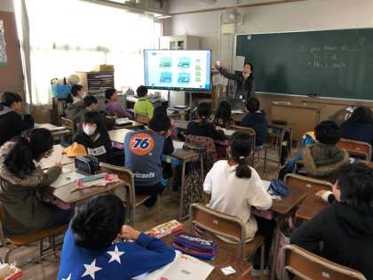 4年生が、外国語活動でC-NETのジーン先生から筆箱に入っている品々の名前やその個数や色について英語のネイティブな発音表現に親しみながら学びました。