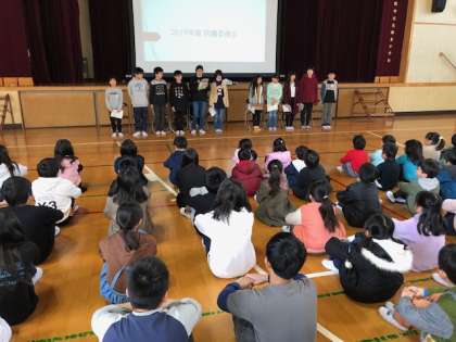 今朝の児童集会は、図書委員会の発表です。図書委員が、絵本「さるじぞう」の読み聞かせをしてくれました。舞台の大型スクリーンに映し出しされた情景や場面を楽しみながらお話の世界に引き込まれていきました。