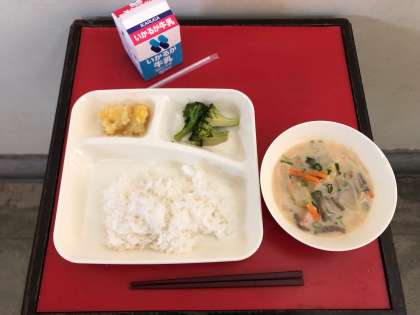 本日の給食献立は、 *かす汁 *ブロッコリーのしょうがづけ *くりきんとん *米飯、牛乳
