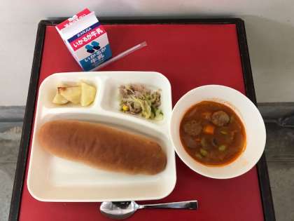 *ミートボールのケチャップ煮 *ツナと野菜のソテー *焼きじゃが *黒糖パン、牛乳