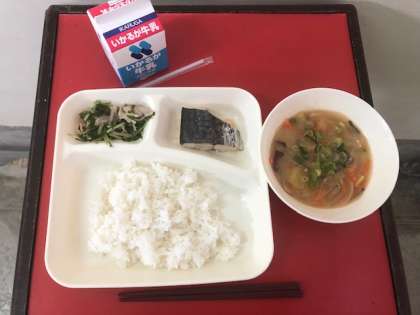 本日の給食献立は、 *さごしのしょうゆだれかけ *みずなの煮びたし *みそ汁 *米飯、牛乳