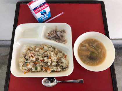本日の給食献立は、 *鳥ごぼうご飯 *焼きれんこん *みそ汁 *米飯、牛乳