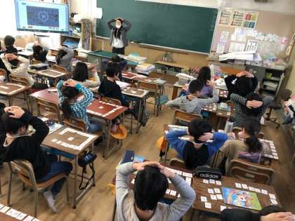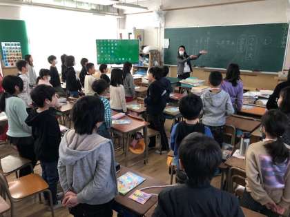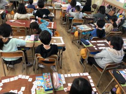 1時間目に3年生が、外国語活動でジーン先生と英語に親しみました。朝のあいさつ、How are you?の問いかけにそれぞれが今日の体調を英語で答えました。その後、カードでゲームをしながらアルファベットの文字や発音に親しみました。