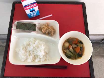 本日の給食献立は、 *鶏肉のからあげ *まる天と野菜のうま煮 *焼きのり *米飯、牛乳