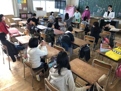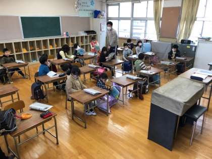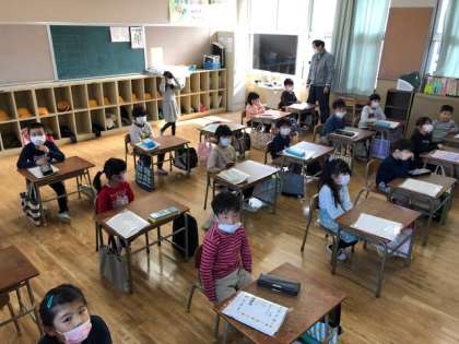 手洗いをしてから教室に入り、机の間隔をあけて座ります。マスクの着用で友だちとの会話もいつもよりは、控えめにして先生のお話を聞きました。友だちと過ごすひと時を楽しんでいました。