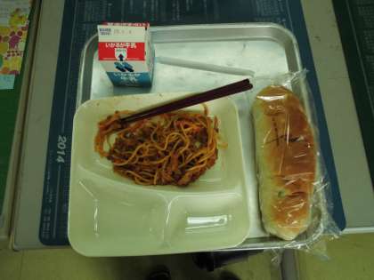 6月に入り、分散登校ではありますが、学校が再開しました。そして給食も始まりました。今日の献立はおさつパン・牛乳・スパゲッティミートソースです。1年生にとっては初めての給食です。