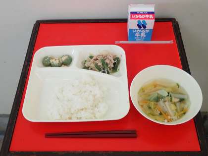 今日の給食は、豚肉と野菜のいためもの・すまし汁・きな粉よもぎだんごです。