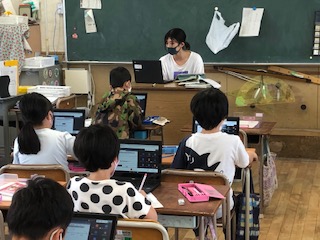 教室にいる子や家にいる子、それぞれ場所は違いますが、パソコンを通して同じ内容の学習をしています。