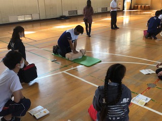今日は、PTA会長の前川さんに講師としてお招きし、初期対応の大切さと心肺蘇生法を教えていただきました。