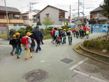 (ウ) 1〜2列でまとまって歩く。他の班と合流しない。