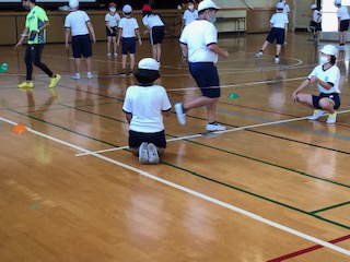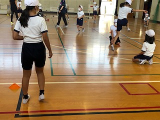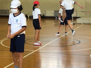 小グループに分かれて、ゴムひもを跳んで、踏み切る足を決めていきました。
