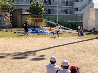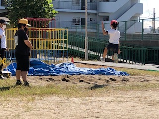 児童は、ふみきりまでの助走の距離と歩幅を考えて練習し、記録を測りました。