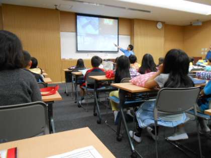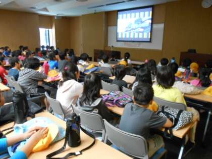 まずは、工場見学に先だって会議室で工場紹介ビデオを視聴しました。子どもたちは、職員さんの分かりやすく丁寧な説明に真剣に聞き入ってました。