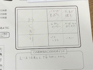 児童は学習したことをもとに、主食・主菜・副菜と栄養のバランスを考えながら、自分独自の弁当をワークシートに書いていきました。