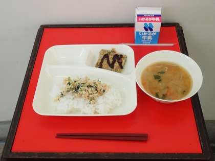 今日の給食は、大阪名物「お好み焼き」と豚汁、とりなっ葉いため(新登場)でした。「とりなっ葉いため」は鶏のささみとだいこんの葉を使った、ごはんによく合う献立です。美味しくいただきました。