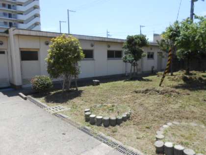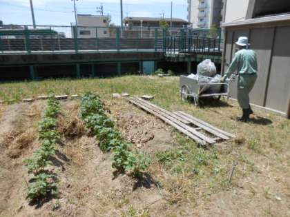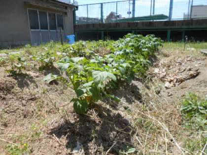 運動場周辺のグリーンベルトを本校管理作業員が、整備しています。プール周りを雑草が、勢いよく生い茂る前に草刈り機で処理をしていきます。雑草を刈り取られ、すっきりとした学習園では、ジャガイモの葉が、気持ちよく日光を浴びていました。
